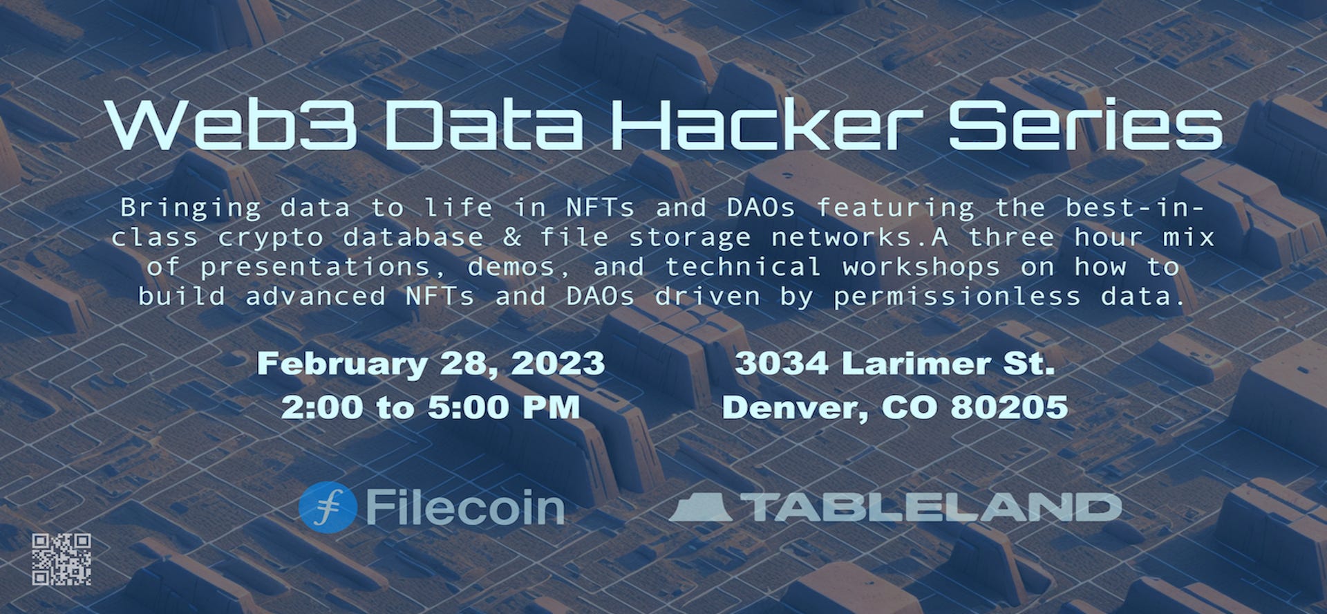A contingent of our core team will be at ETH Denver next week to host the first workshop in our Web3 Data Hacker Series. In partnership with the Filecoin Foundation, we have an awesome lineup of presenters showcasing the best-in-class technology stack supercharging web3, NFTs, DAOs, and data on the web. Check out the flyer for more details and register for free here.