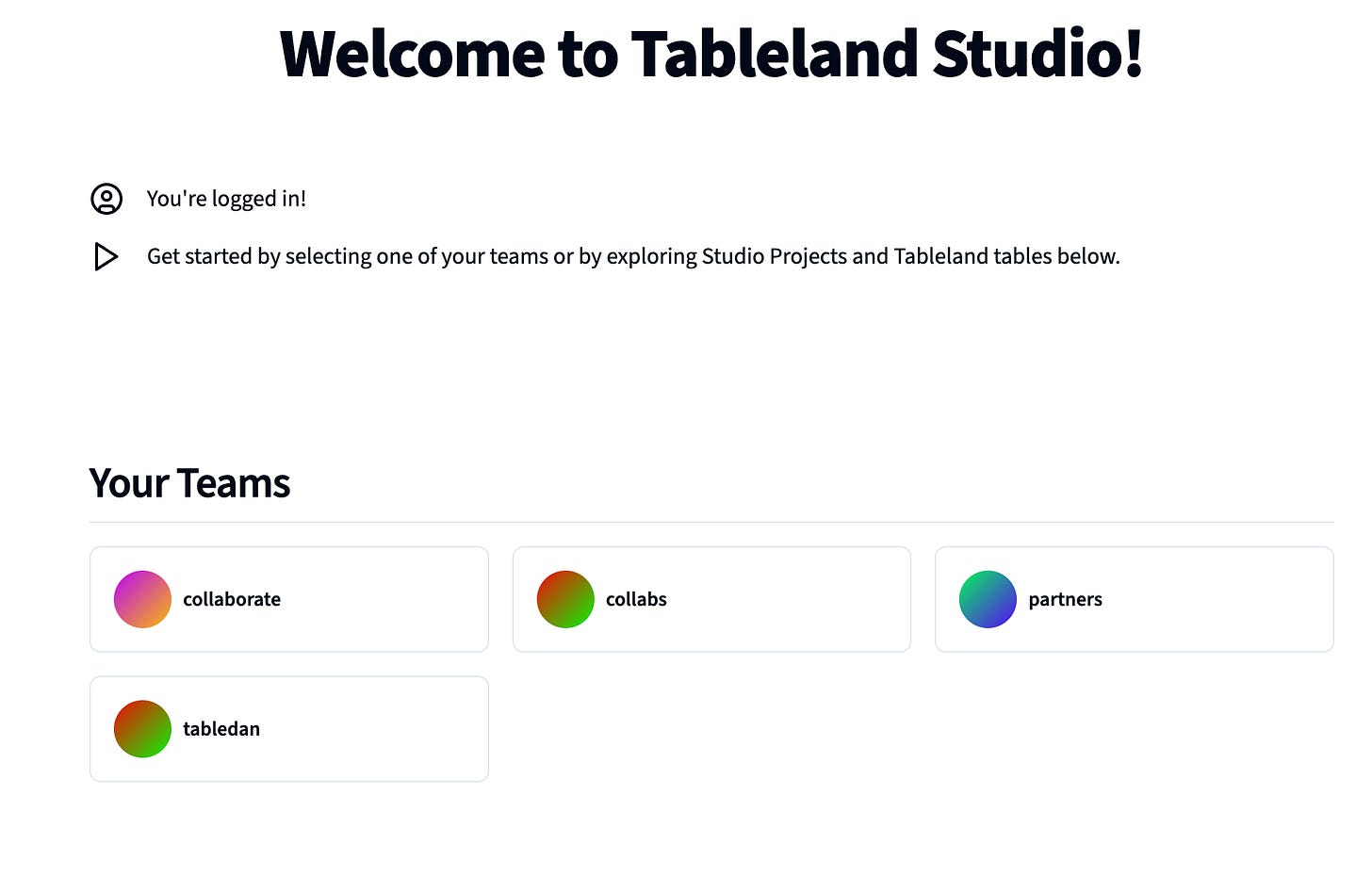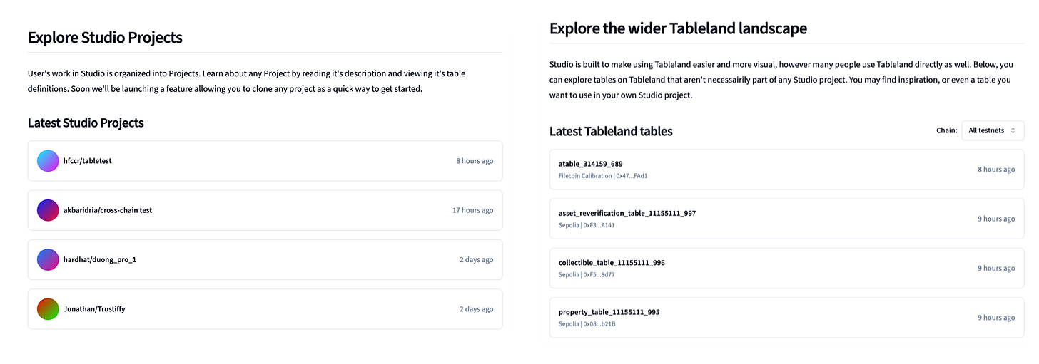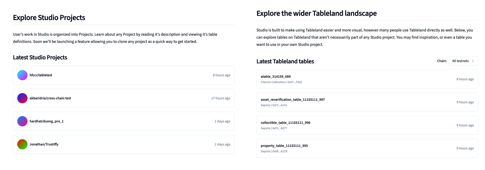 We launched a new landing page for Studio at https://studio.tableland.xyz. There, you can see a list of featured Studio projects, the latest Studio projects, the latest Tableland tables, and the most active Tableland tables (where you can see detailed information about the table and view the table's data). We'll be adding more features around Tableland table pages soon!